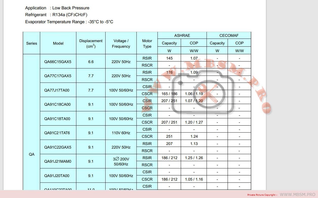 Panasonic rotary compressors in general, their compact design, and light weight for greater AC productivity. The compressor is part of the Q Series and has a 1/4 hp capacity. It is designed for low back pressure applications and uses R134a refrigerant with an evaporator temperature range of -35°C to -5°C.