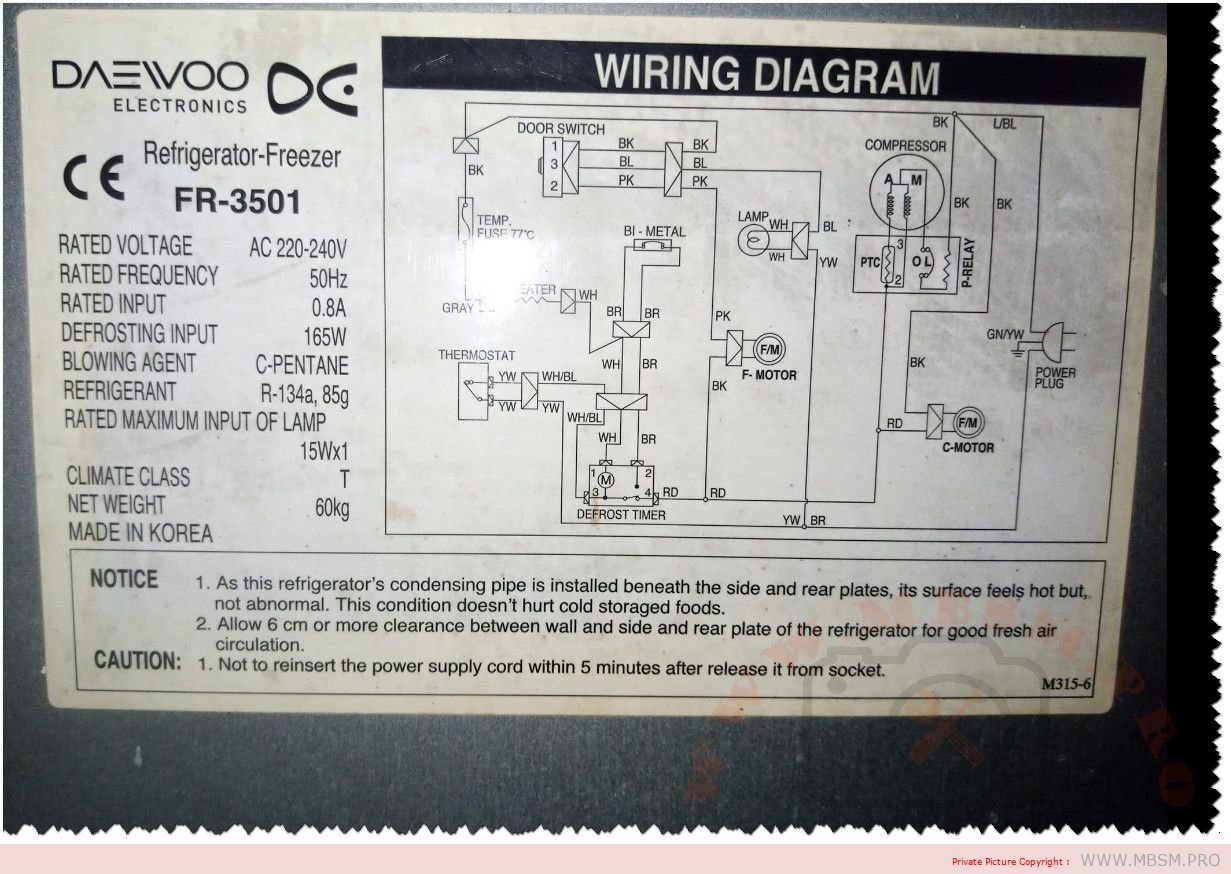 Mbsm.pro, DAEWOO, Refrigerator-Freezer, 350 l, FR-3501, AC 220-240V, 0.8 a, 165 w, compressor, 1/5 hp, R-134a, 85g, HSL25YE-5, lbp, R-134a, 85g